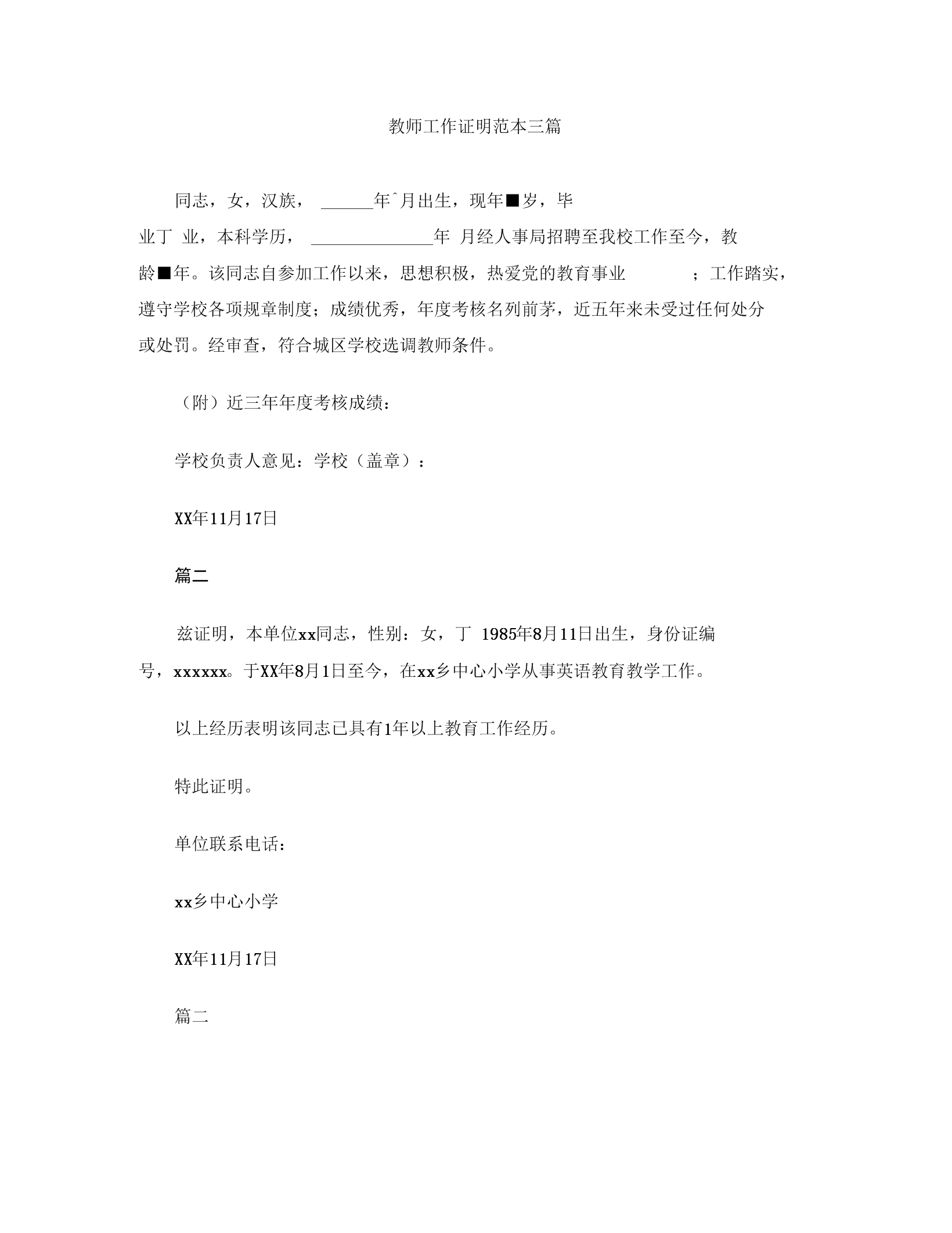 教师工作证明范本三篇.docx 2页