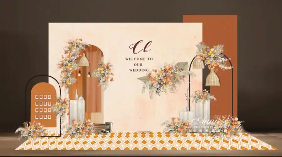 香槟白色简风卡其色婚礼背景墙设计婚庆效果图喷绘样图