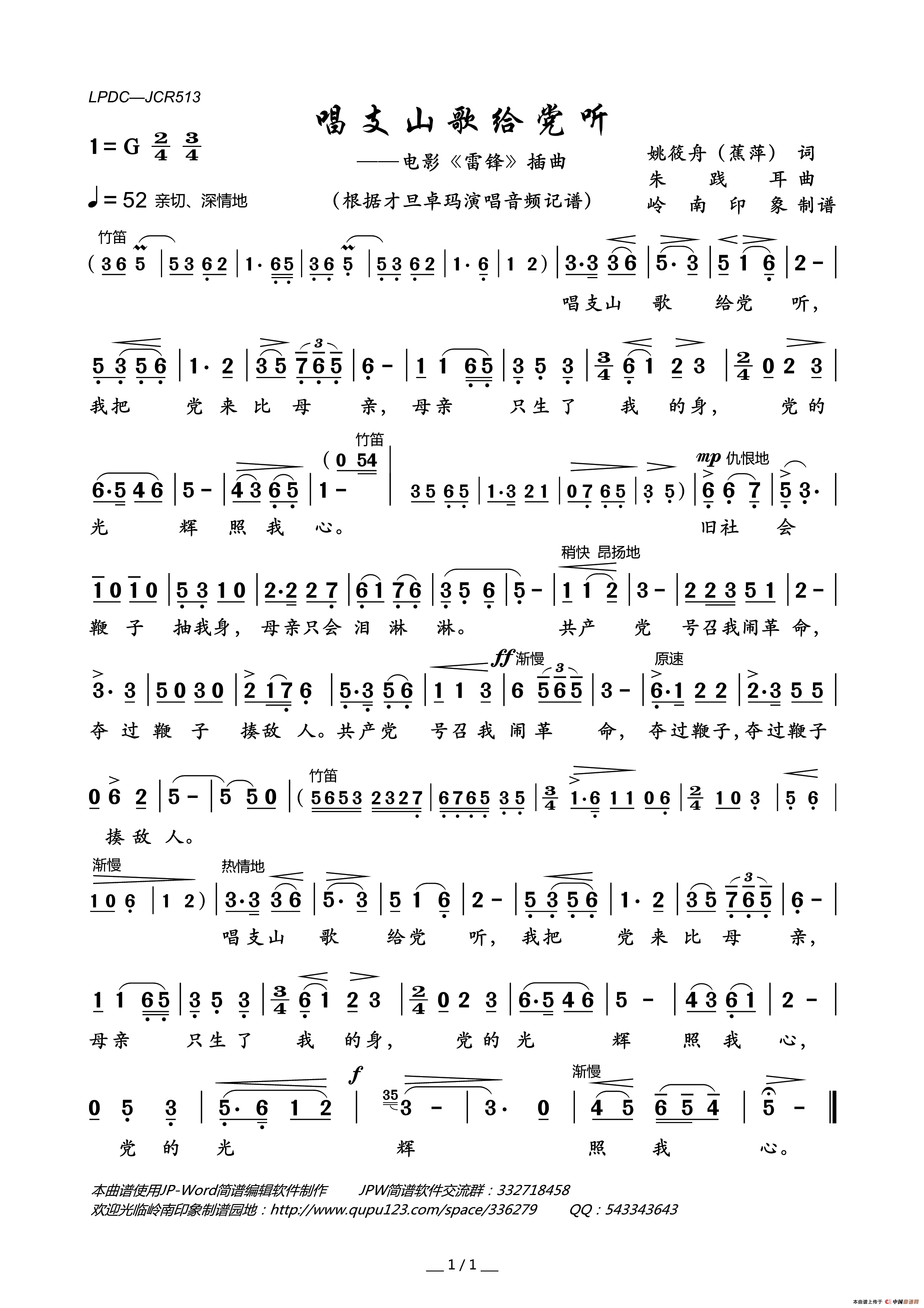 唱支山歌给党听(1965年影片《雷锋》插曲)简谱-通俗曲谱-爱曲谱网