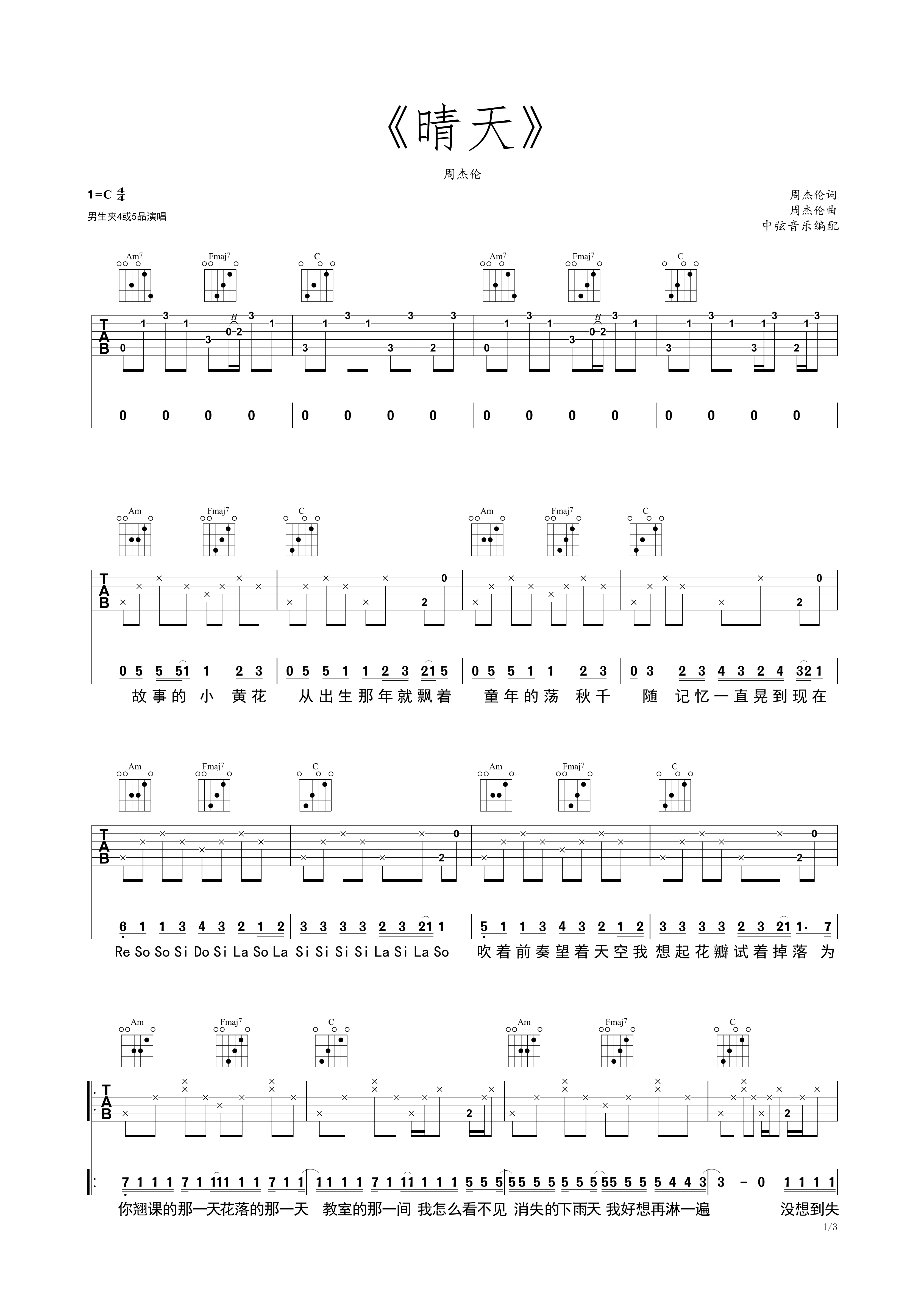 《晴天》 周杰伦 c调精华版c调六线吉他谱-虫虫吉他谱免费下载