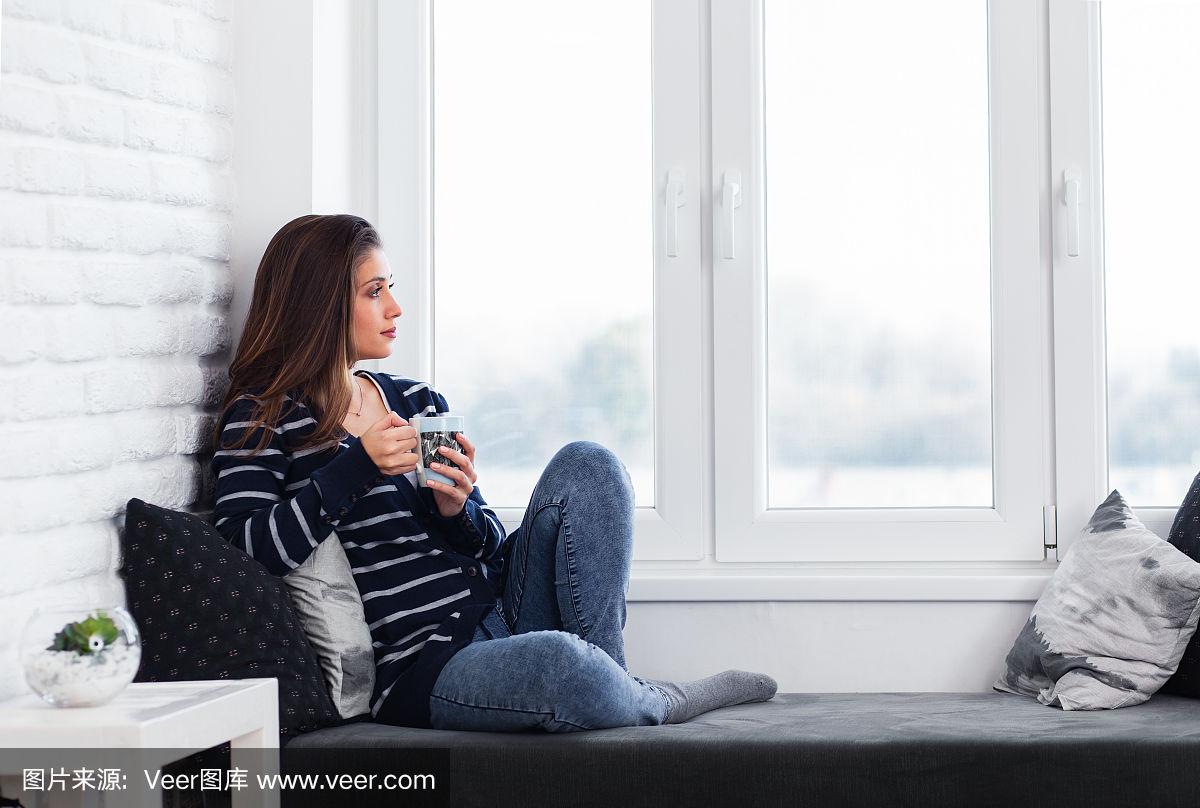 年轻女孩坐在窗边喝着咖啡,放松着.