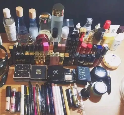 化妆品摆满桌子的照片