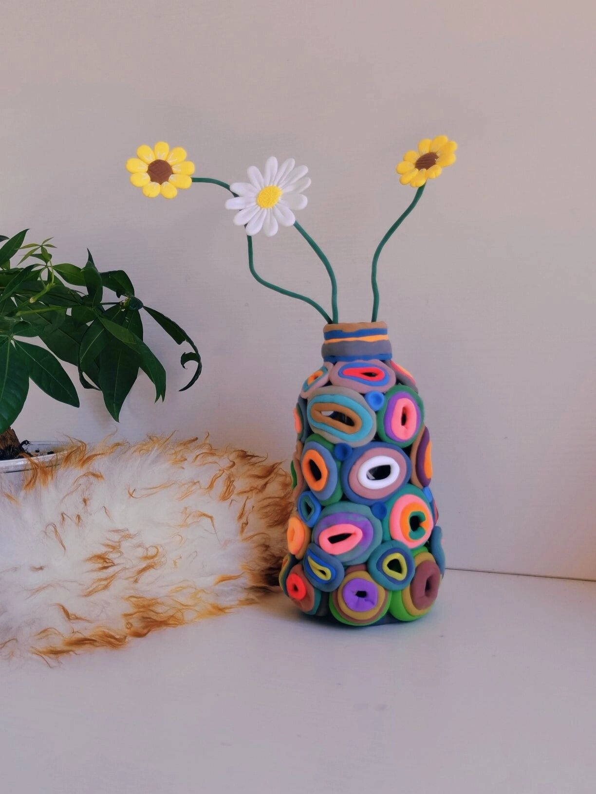 粘土手工|改造花瓶 家里喝完的饮料瓶 用粘土搓点圈圈 随意的粘在瓶子