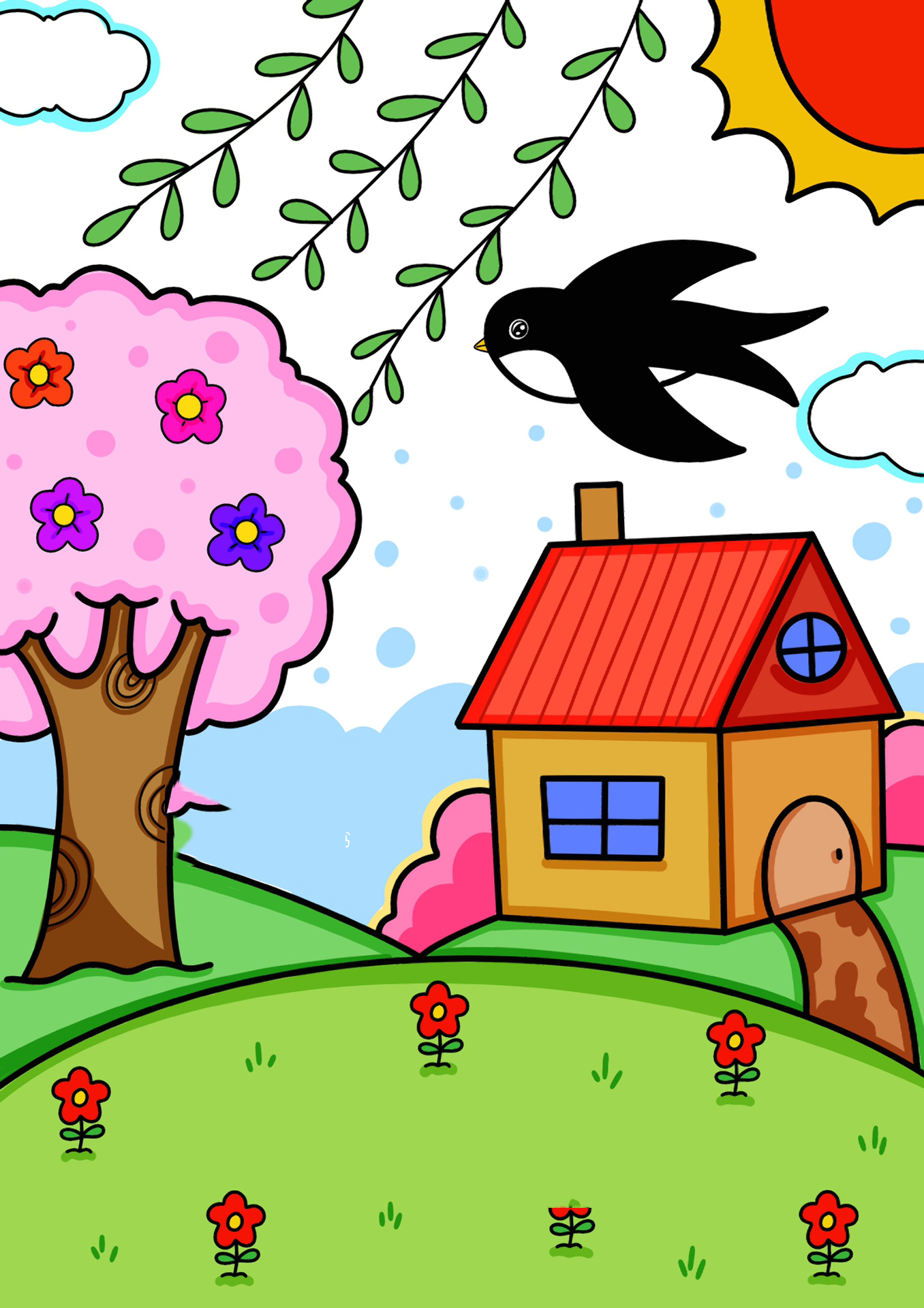 春天风景画 可爱的小房子儿童创意画 简笔画
