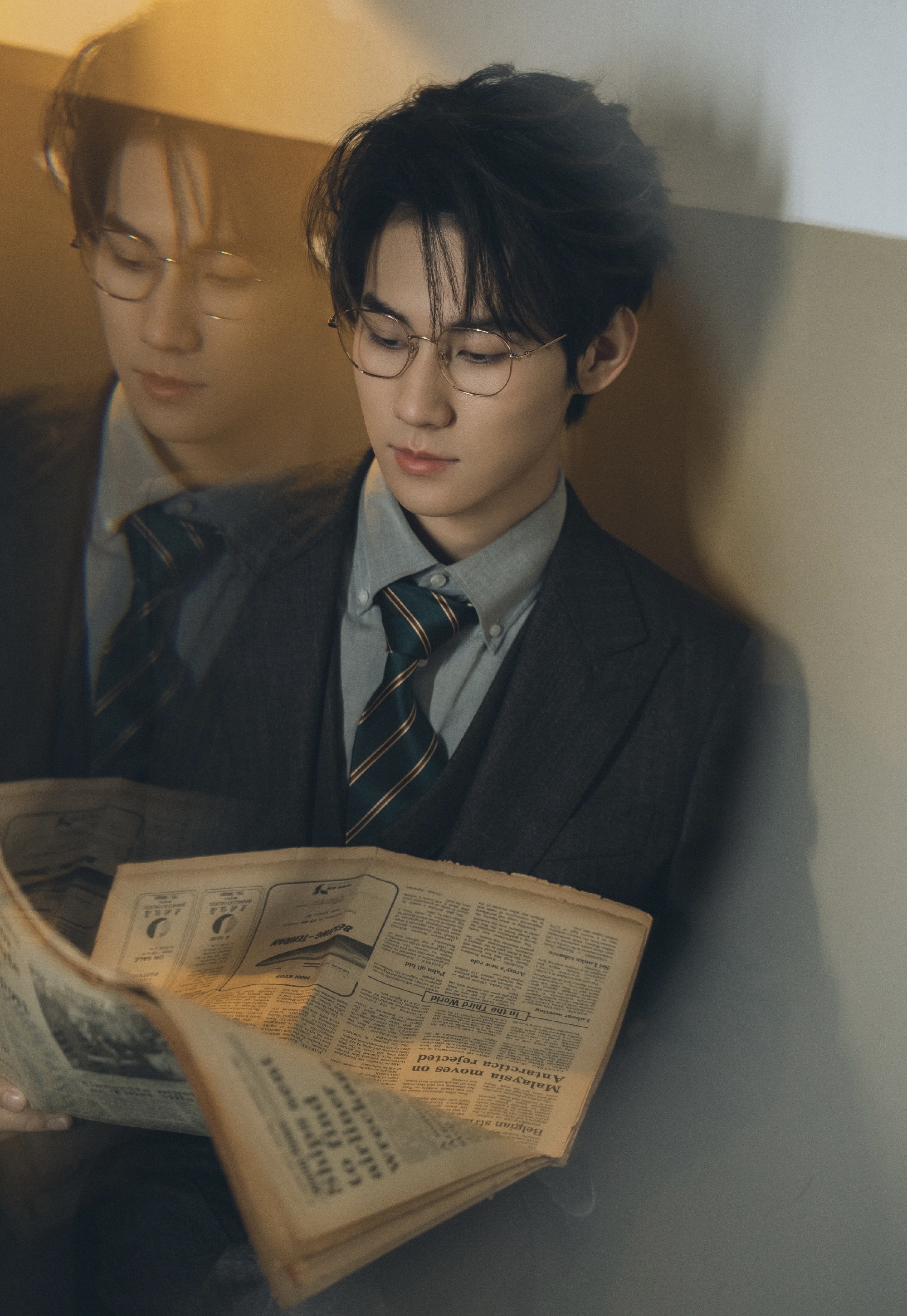 张真源条纹衬衫 棕色西装,戴眼镜的张张鲨我,复古港风帅哥