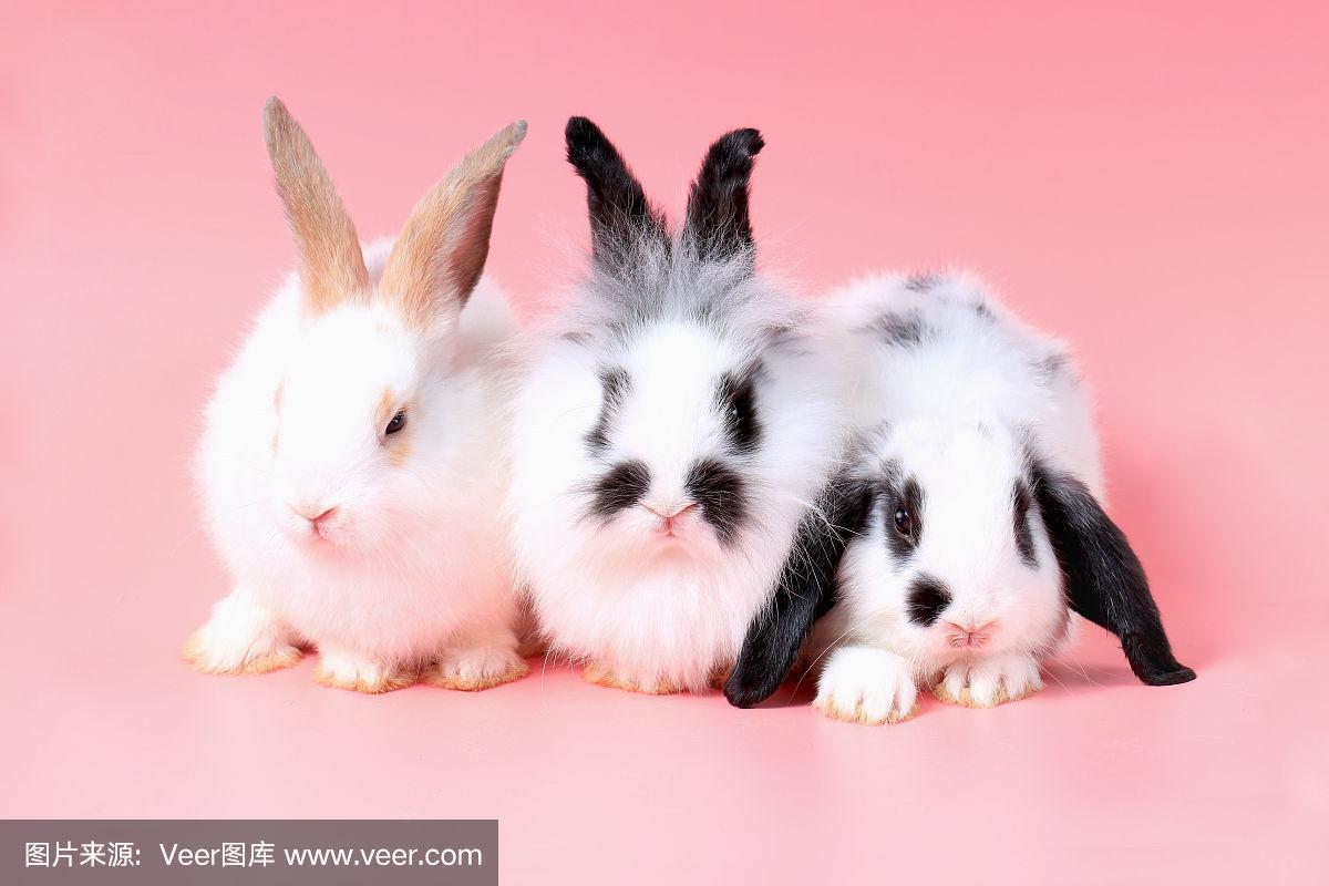三只毛茸茸的可爱小兔子在甜美的粉红色背景上.