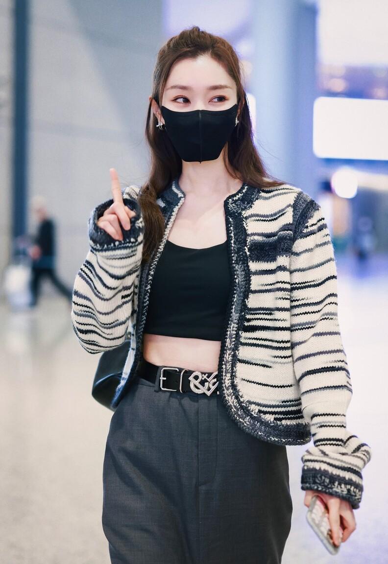 宋轶机场街拍,条纹短外套 灰色西装裙 prada乐福鞋清新自在!
