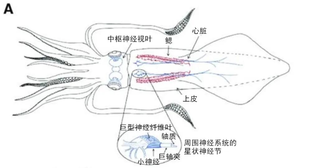 鱿鱼解剖示意图,显示了"巨型轴突"的位置 | 参考文献[1] 于是,一个