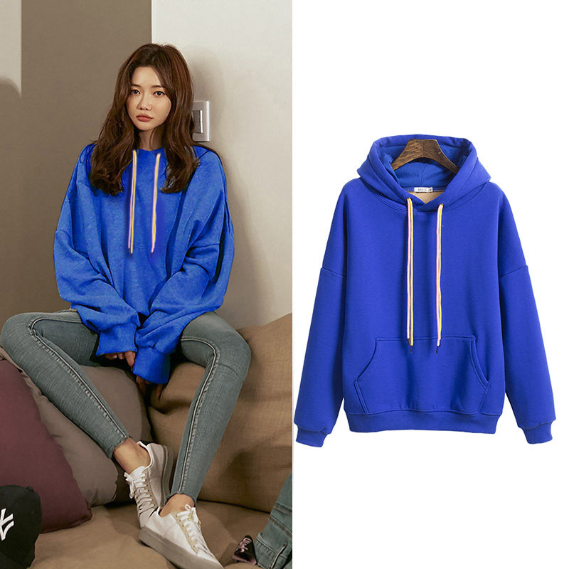 2018秋冬新款韩版宽松宝蓝色加绒加厚卫衣女连帽慵懒风套头外套潮