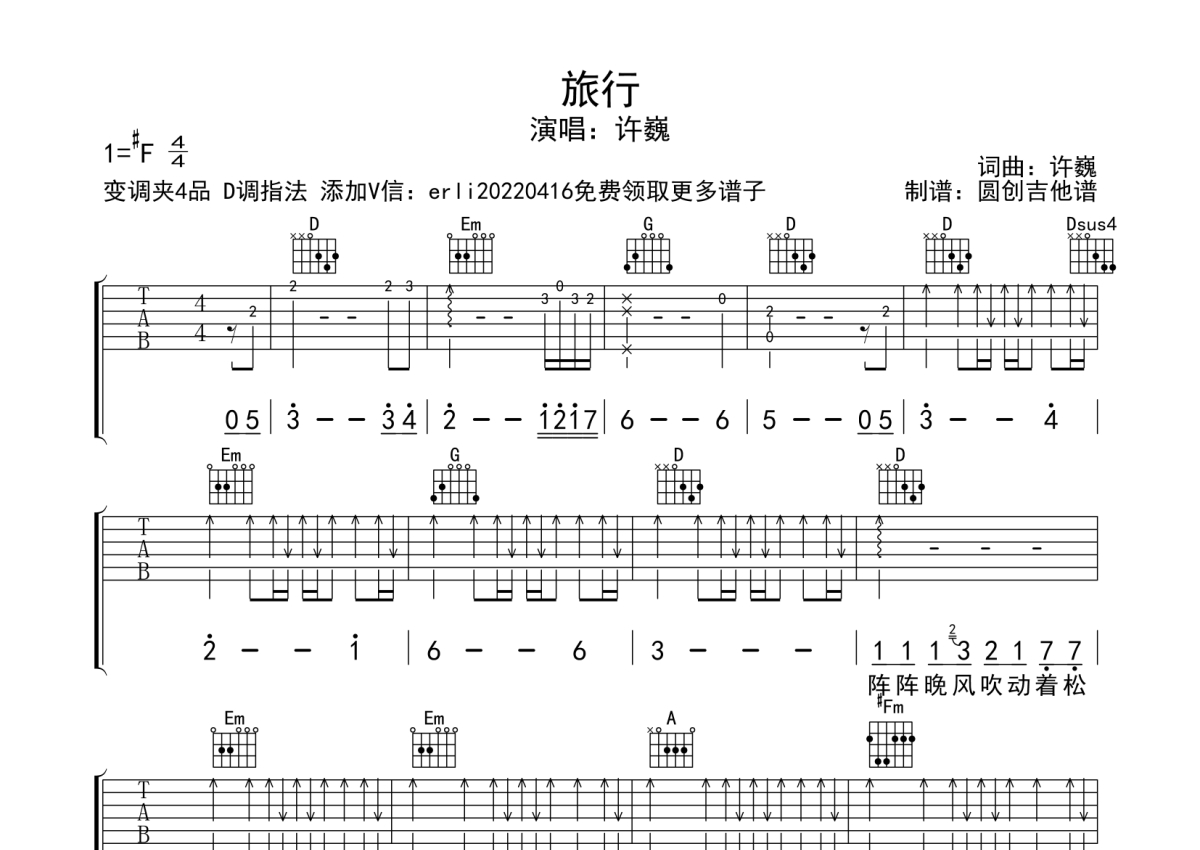 旅行 吉他谱_许巍_d调《旅行》扫弦六线谱