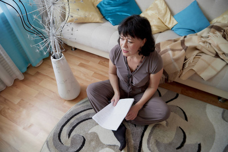 夫人与调情的表达客厅里的中年妇女很好.夫人在家与纸照片
