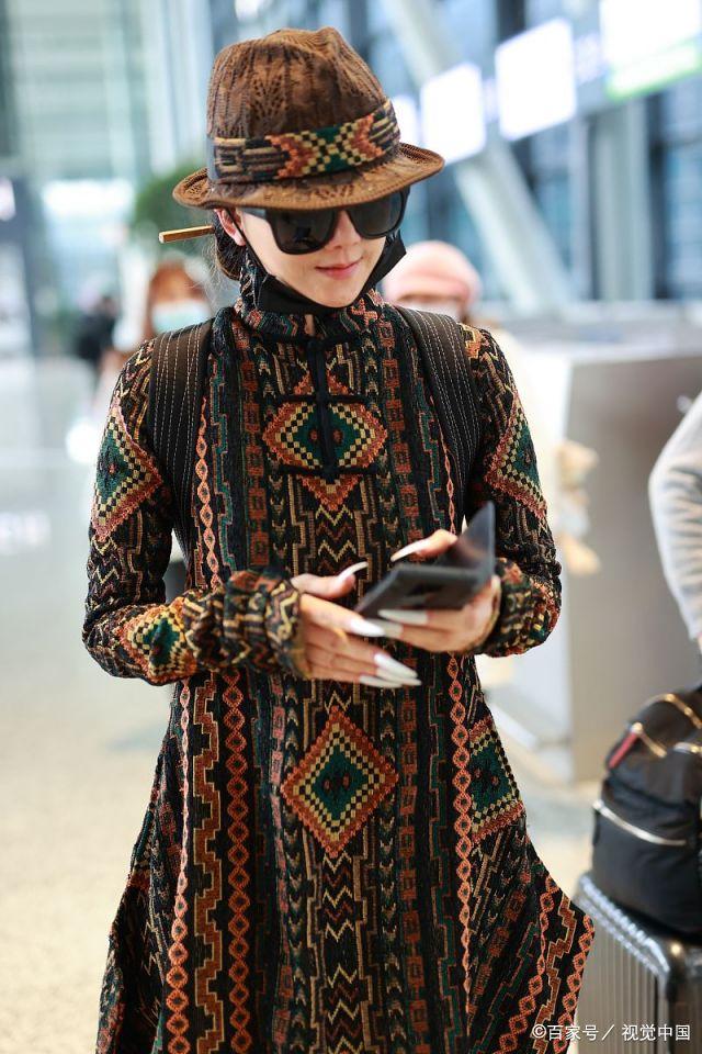 杨丽萍走机场也太高调了一身金龙刺绣连衣裙尽显复古魅力