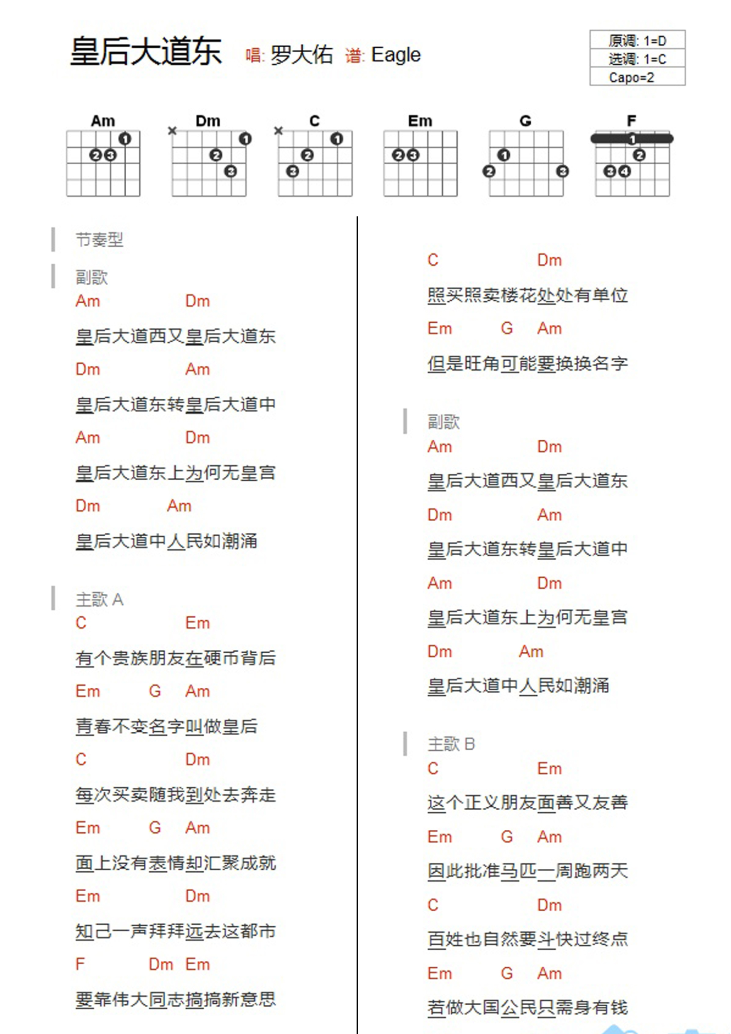 罗大佑皇后大道东吉他谱c调吉他弹唱谱和弦谱