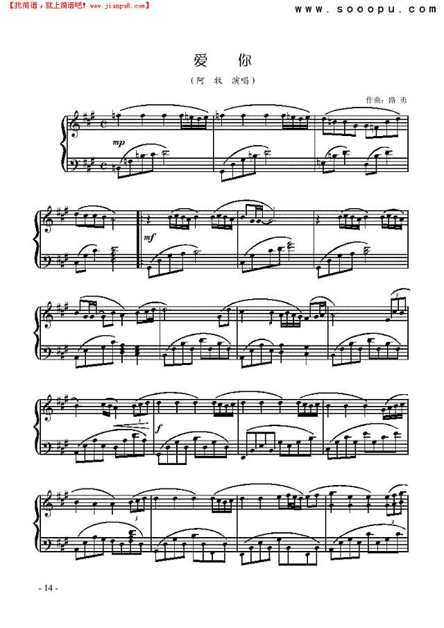 钢琴谱:爱你(女声弹唱版,陈芳语)