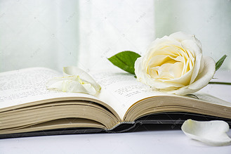 书本上的白色玫瑰花下午书本白色玫瑰花室内静物摄影图配图