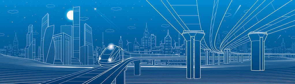 塔和摩天大楼,现代化的城市,商业建筑.夜景.在蓝色背景上的白色线条.