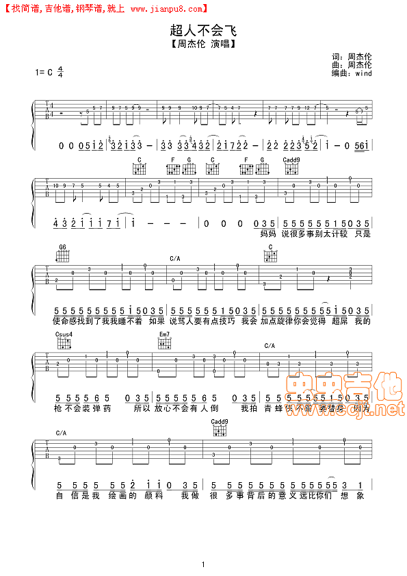 周杰伦《超人不会飞》吉他谱c调吉他弹唱谱