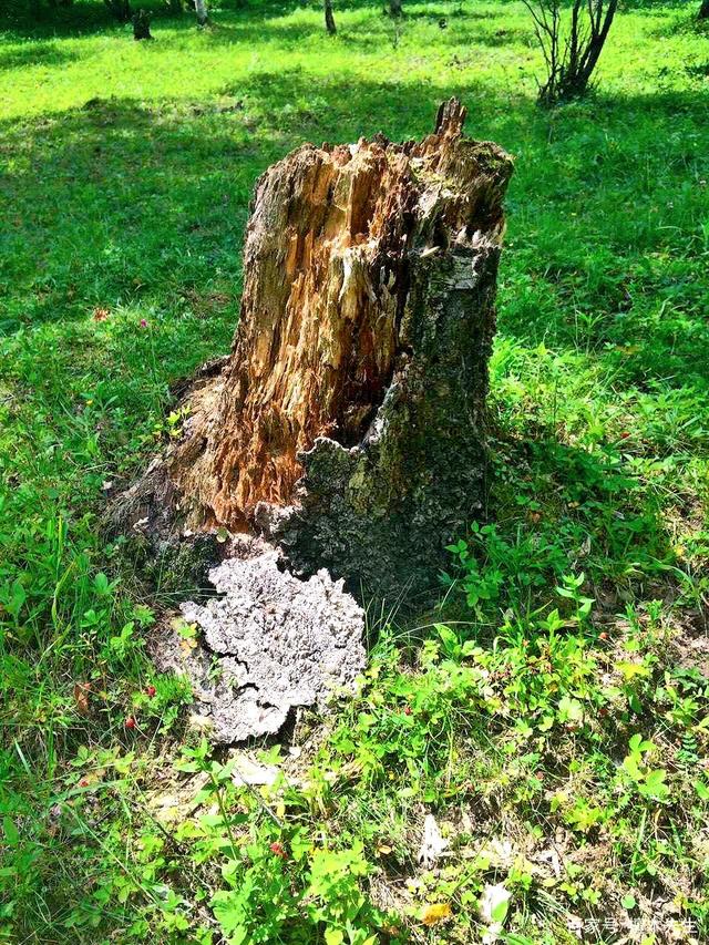 树林里的枯树桩在周围小草衬托下都很美