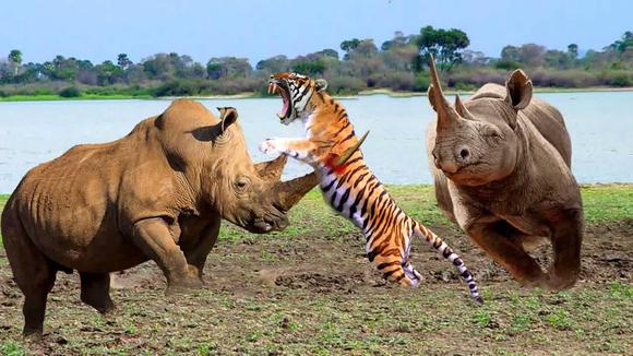 猎豹,老虎被犀牛疯狂袭击时惊慌失措,野生动物袭击!