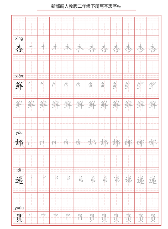 部编二年级下册写字表字帖,笔顺练习,一课一练,可打印下载
