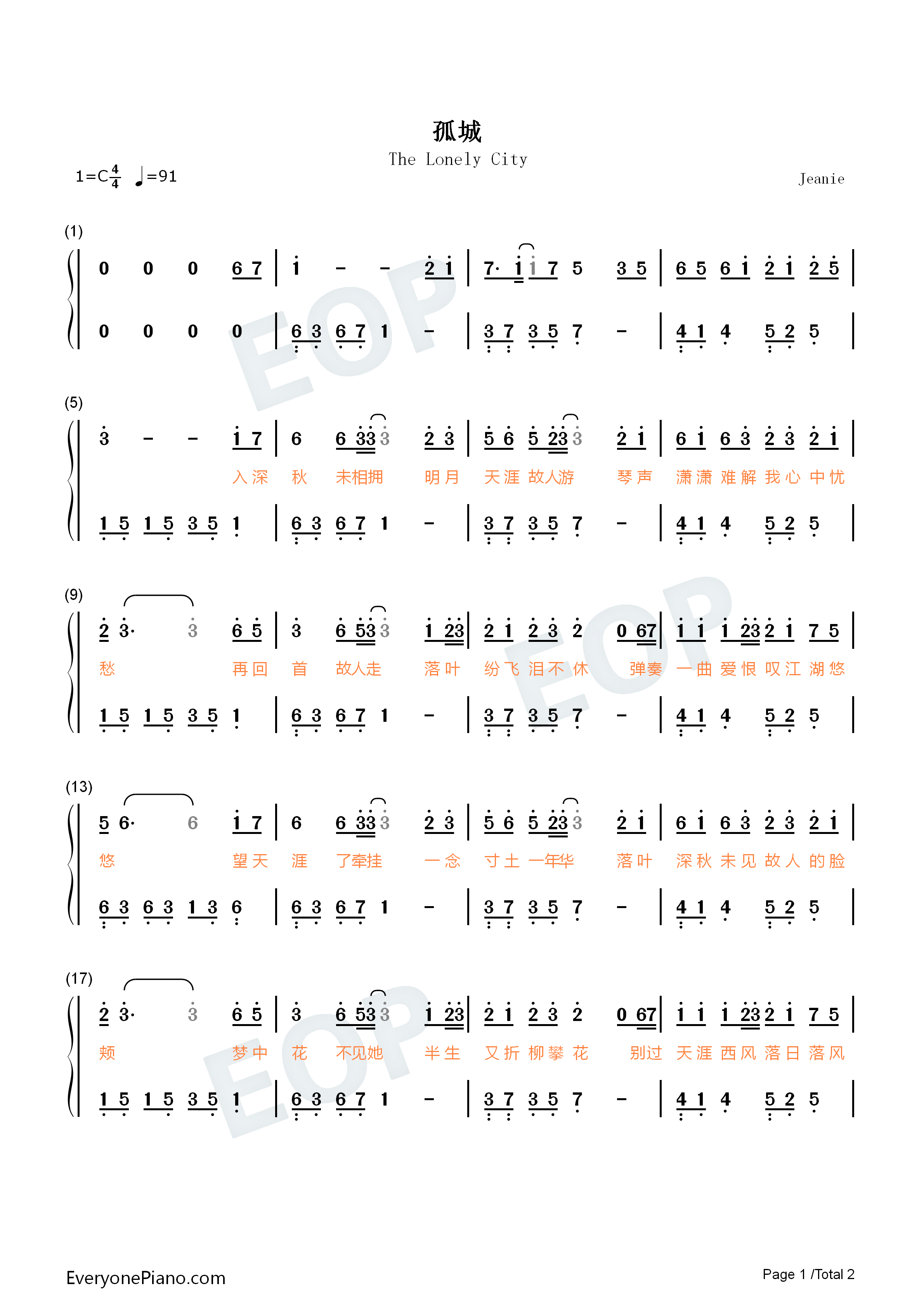 孤城简单版月照入心头世间的爱恨情仇抖音双手简谱预览1
