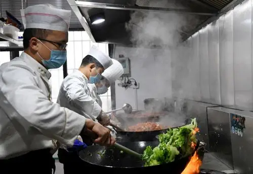 4月15日,在长沙市岳麓区一家湘菜餐厅,厨师在后厨佩戴口罩炒菜.