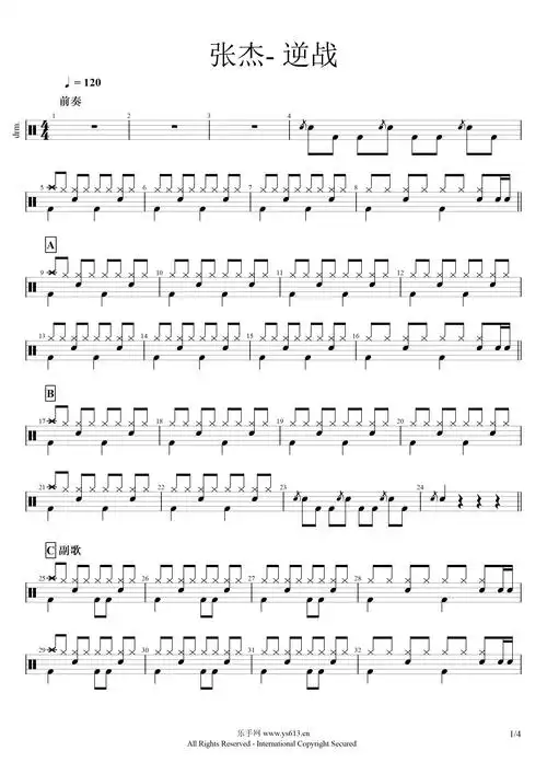 逆战鼓谱_逆战架子鼓谱高清版_张杰-椰壳鼓谱网