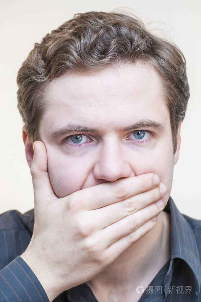 安静保持安静一幅年轻的蓝眼睛男人用手指在白色背景上闭上嘴的肖像