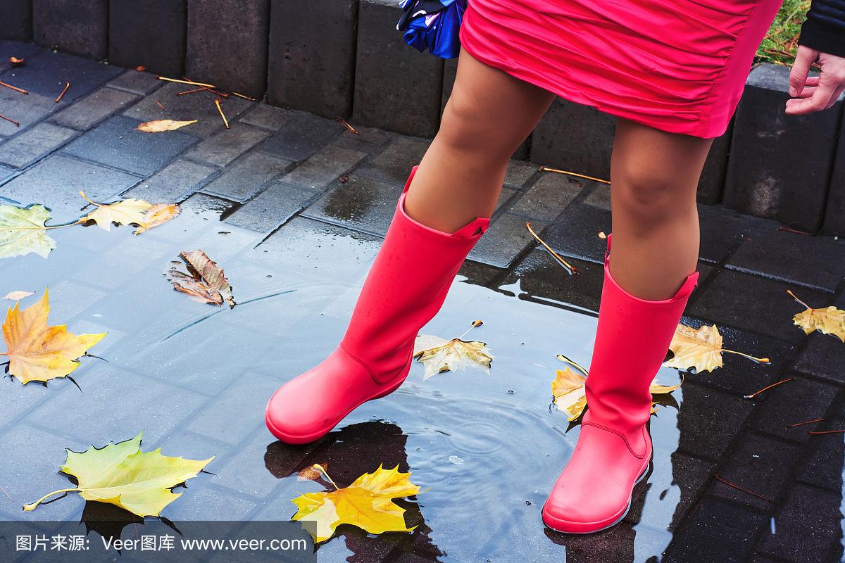 下雨天鞋淋湿雨靴的女人照片