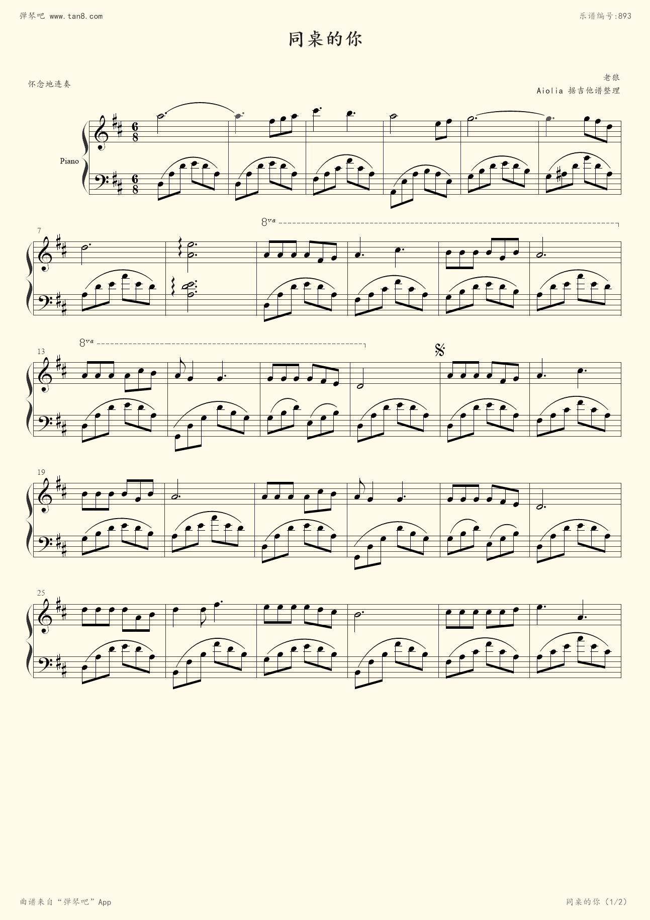 《同桌的你,钢琴谱》老狼|弹吧|钢琴谱|吉他谱|钢琴曲|乐谱|五线谱