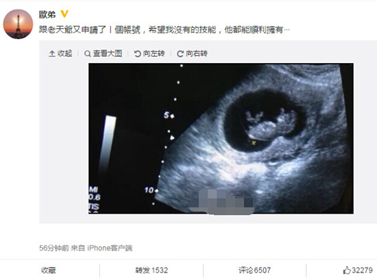 娱记阳阳晒女性b超照片,临床诊断怀孕6周,孩子父母身份未公布