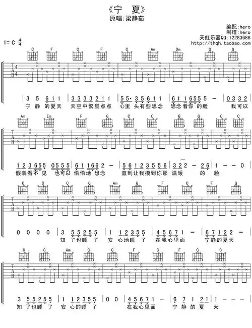 梁静茹《宁夏》吉他谱_c调和弦指法_高清六线图片弹唱谱_天虹乐器新手