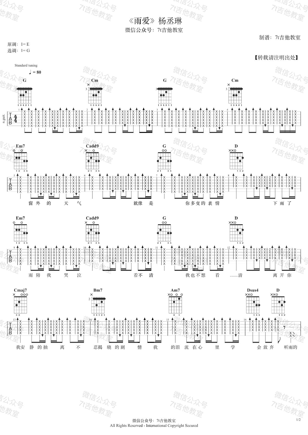 雨爱吉他谱-杨丞琳-c调原版吉他六线谱1