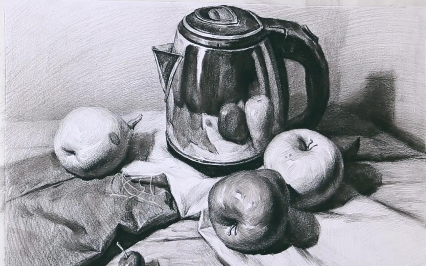 初级静物组合不锈钢壶苹果白衬布 北京华艺名画室