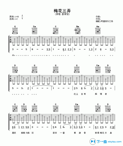 梅花三弄吉他谱_姜育恒_g调弹唱55%原版 - 吉他世界