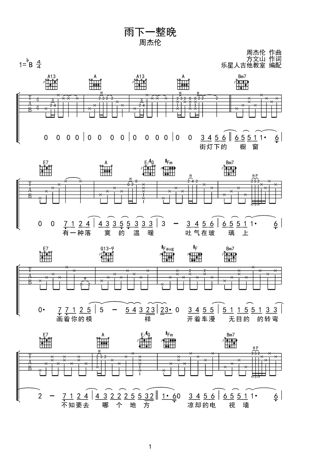 雨下一整晚吉他谱-弹唱谱-bb调-虫虫吉他