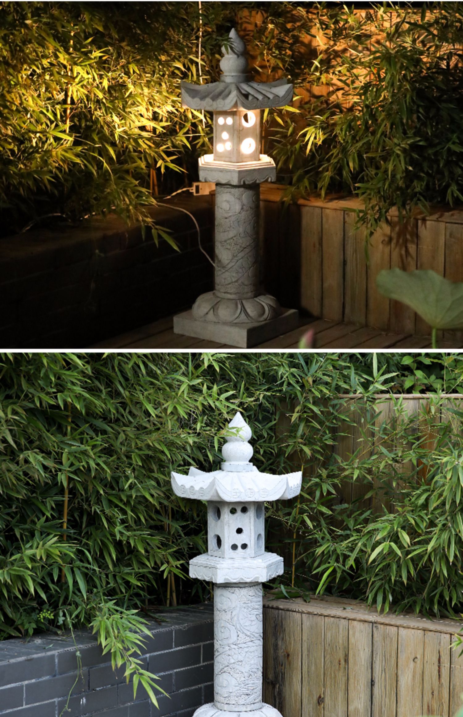 通过图片我们可以看到,石灯非常的小巧,高度50厘米,无论摆放在庭院里