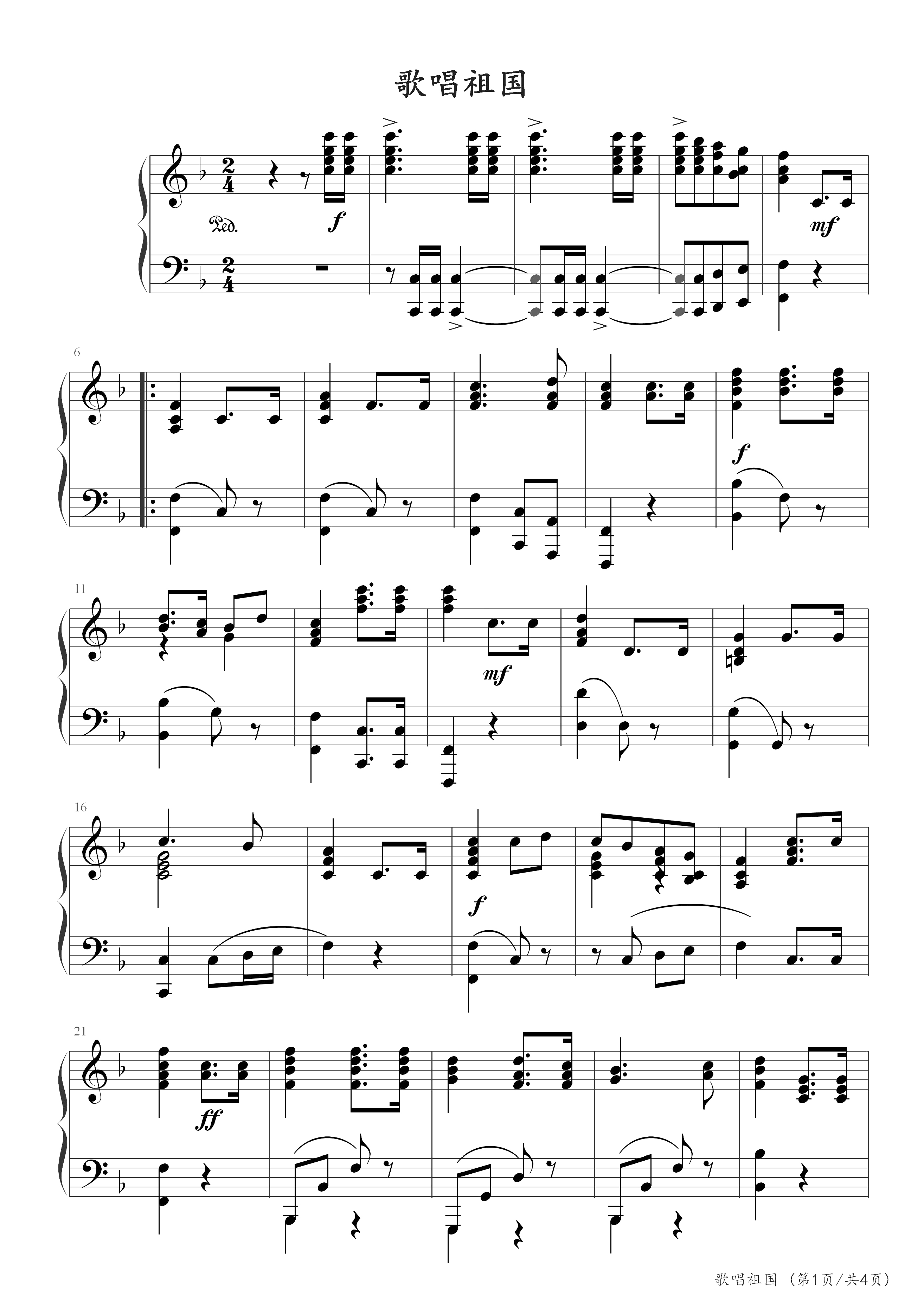 歌唱祖国钢琴谱f调流行钢琴五线谱