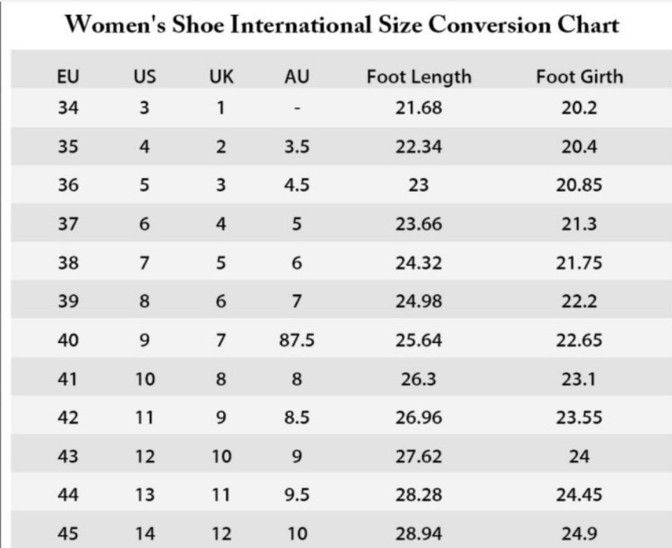 女鞋尺码对照表(英文)
