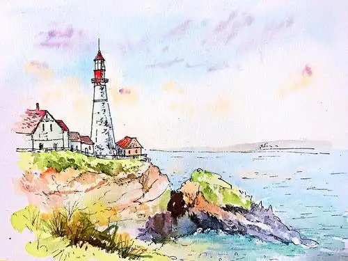 钢笔淡彩灯塔风景画步骤图