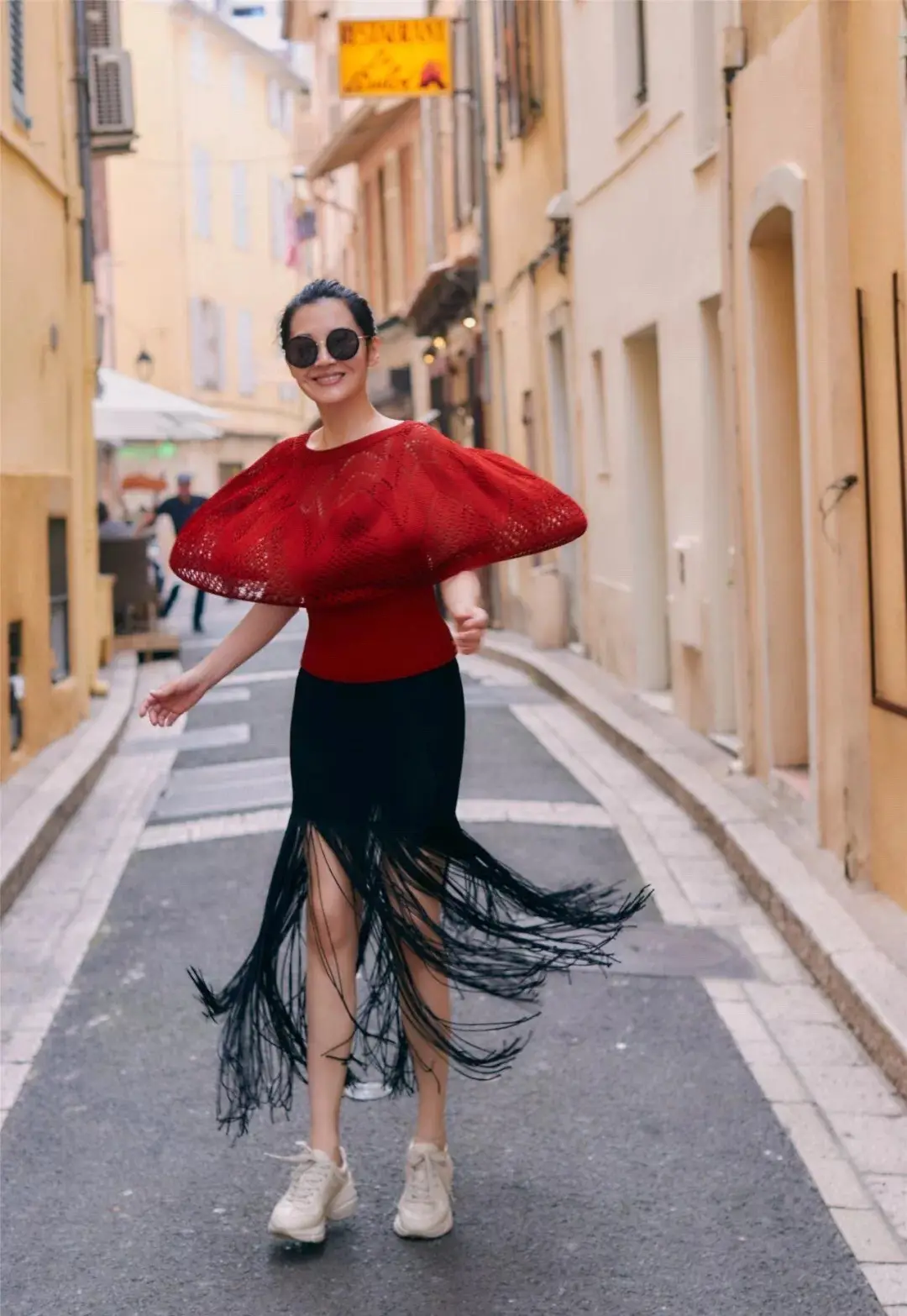 许晴身穿黑色针织衫,搭配黑色超短裙,脚踩黑色高跟长筒靴|街拍_网易