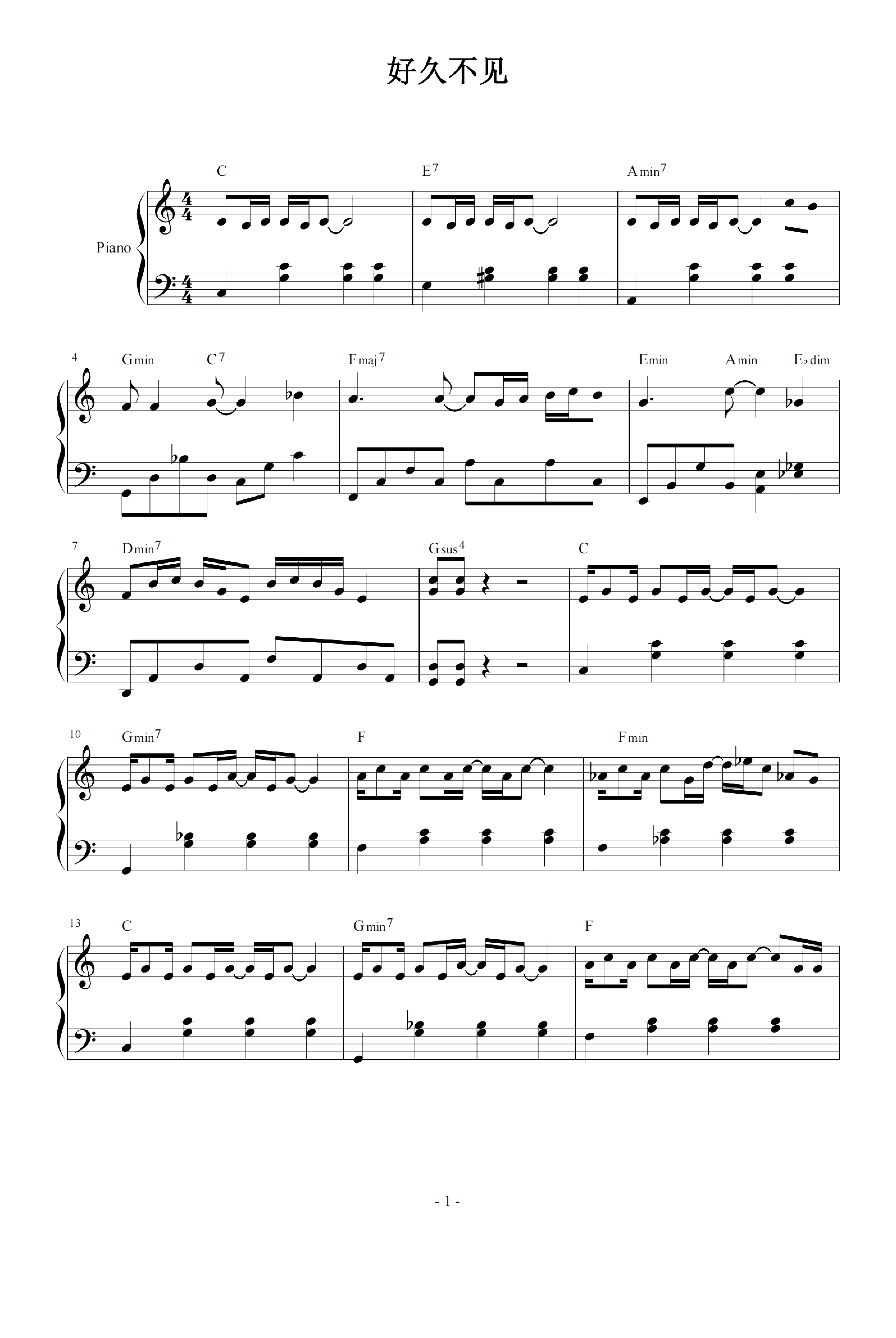 好久不见钢琴谱周杰伦c调流行钢琴五线谱
