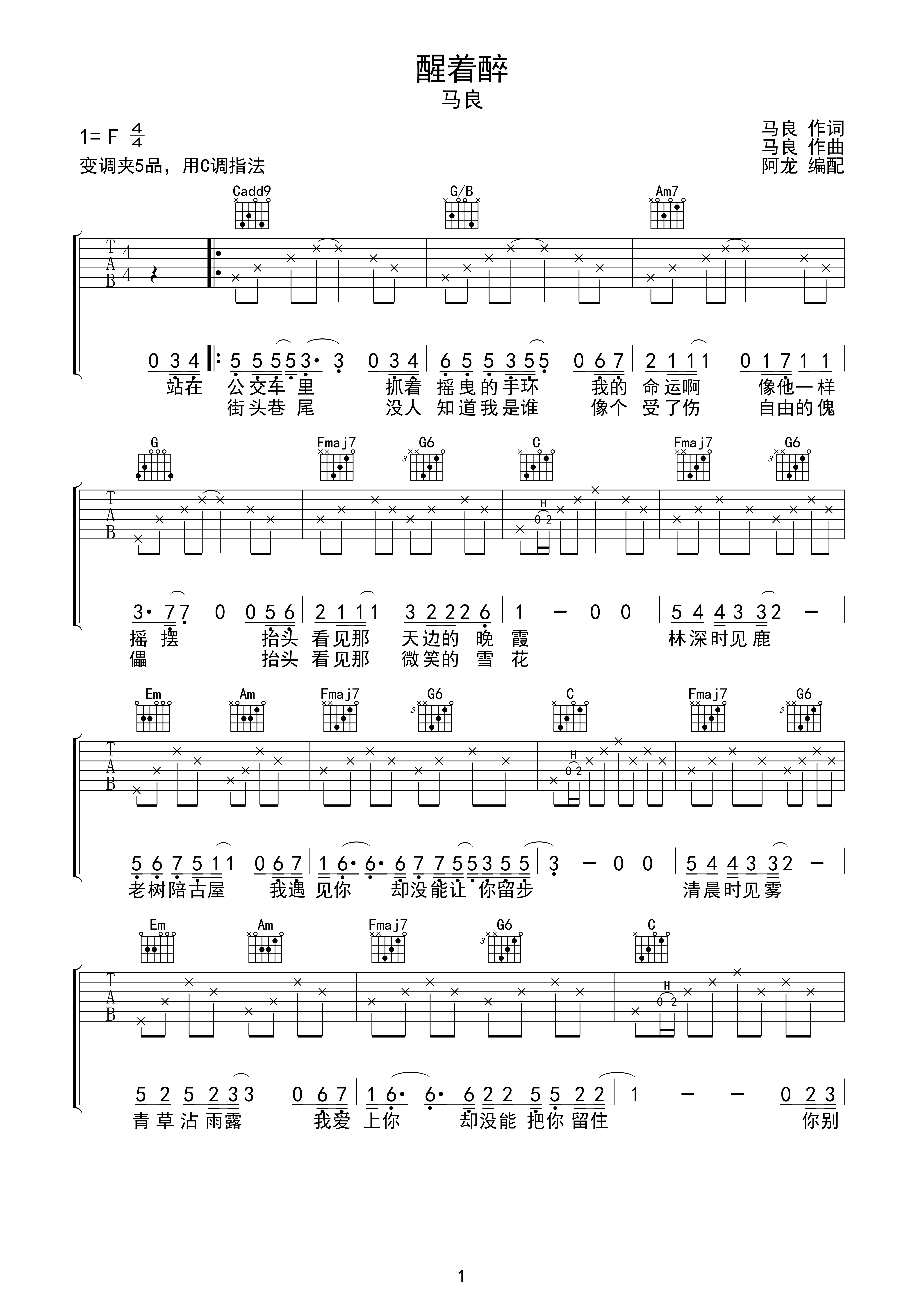 原版六线谱_吉他弹唱教学醒着醉吉他谱_马良_c调指法带间奏编配_吉他