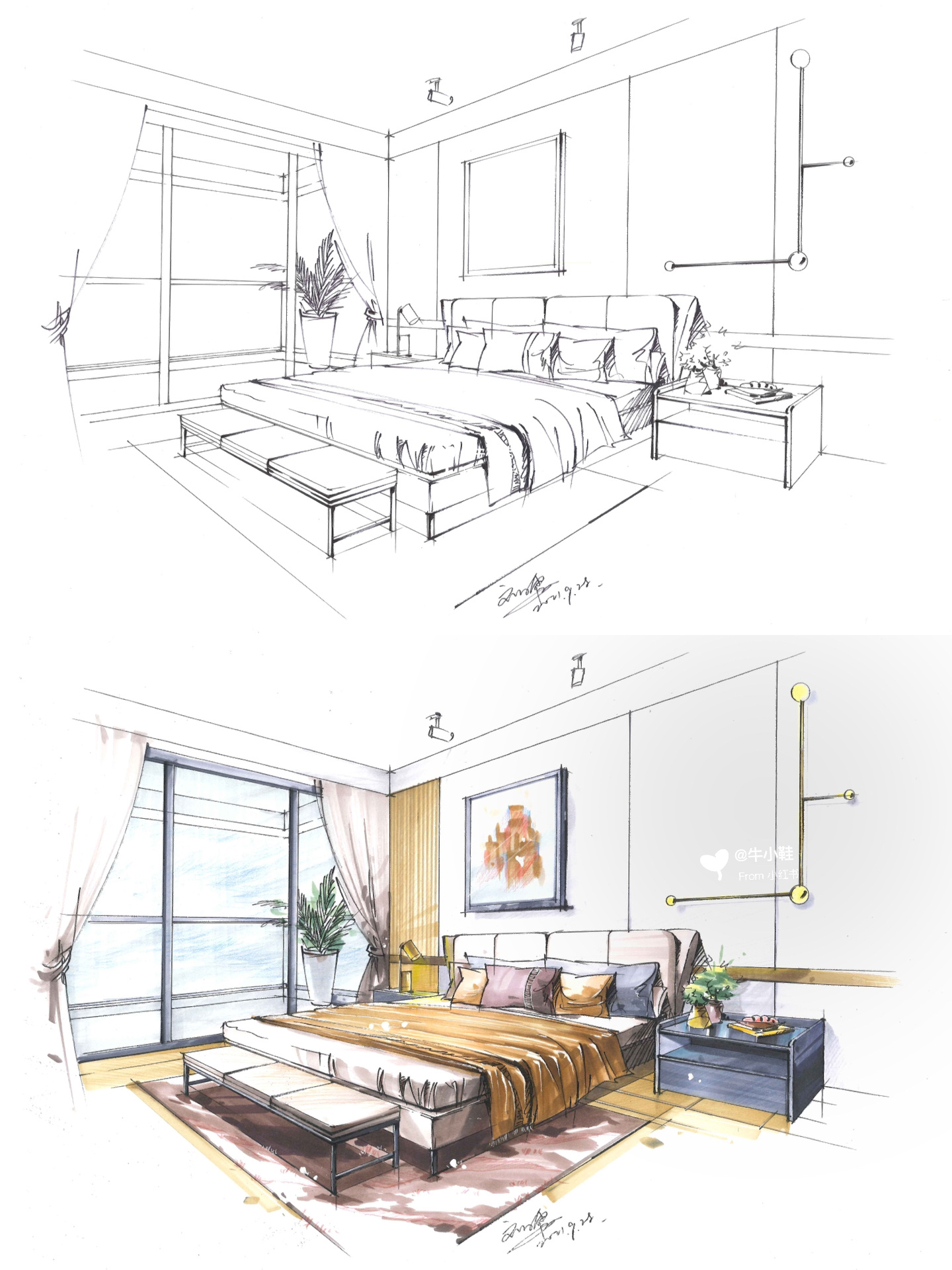 室内设计马克笔手绘效果图「主卧」 手绘主卧效果图,两点透视画法,后