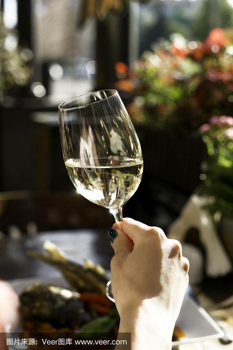 女孩手里拿着一杯白葡萄酒
