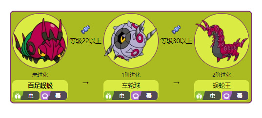 百足蜈蚣22级进化成车轮球然后30级进化成蜈蚣王.