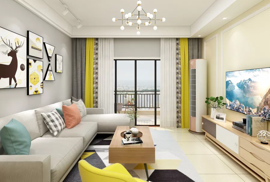 暖色鲜明对比且造型价格相当实惠,简单吊顶凸出层次又不压抑,沙发l型