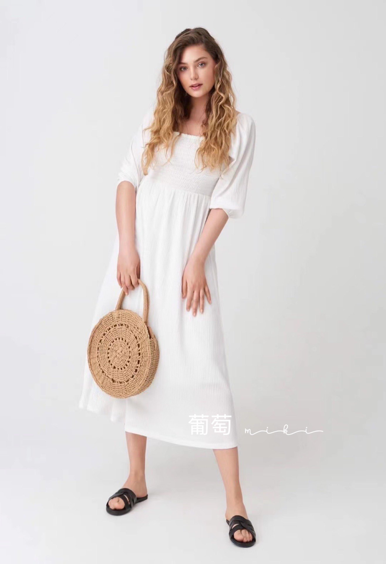 波兰单贵货sin~y 法式浪漫女人味方领褶皱泡泡袖长款白色连衣裙