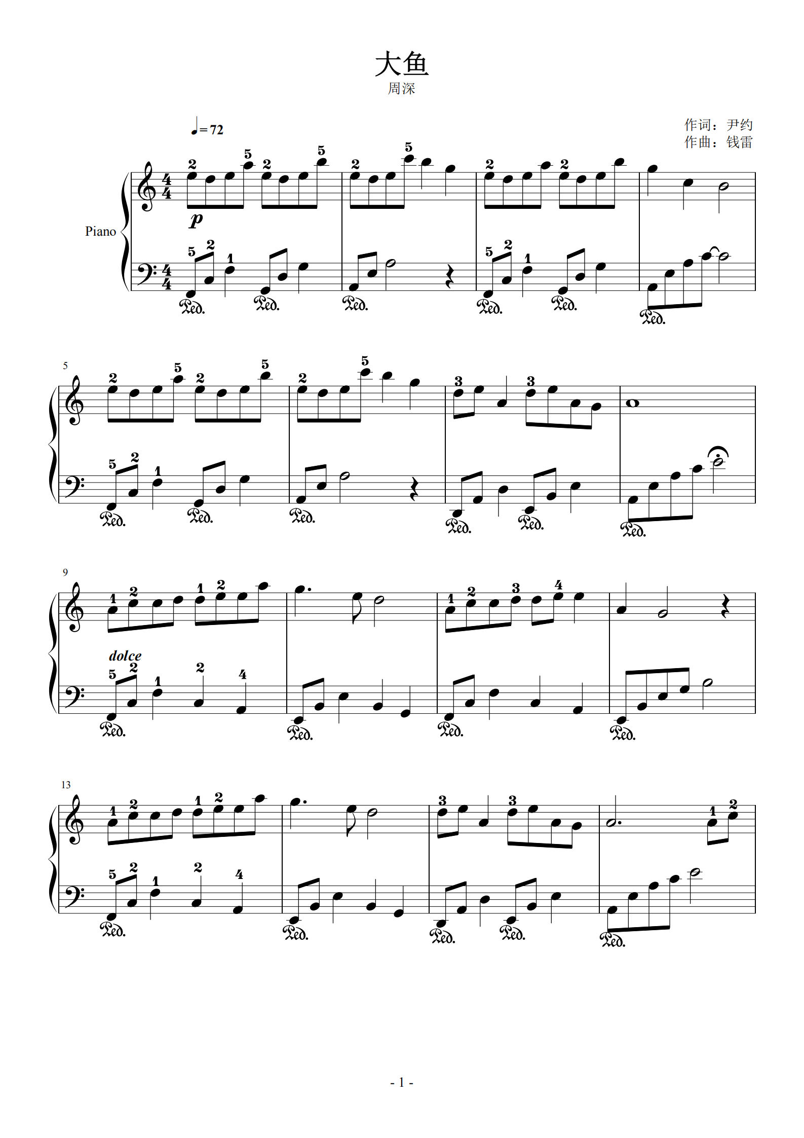 钢琴谱 大鱼 c调 独奏 带指法 五线谱 带歌词.pdf 7页