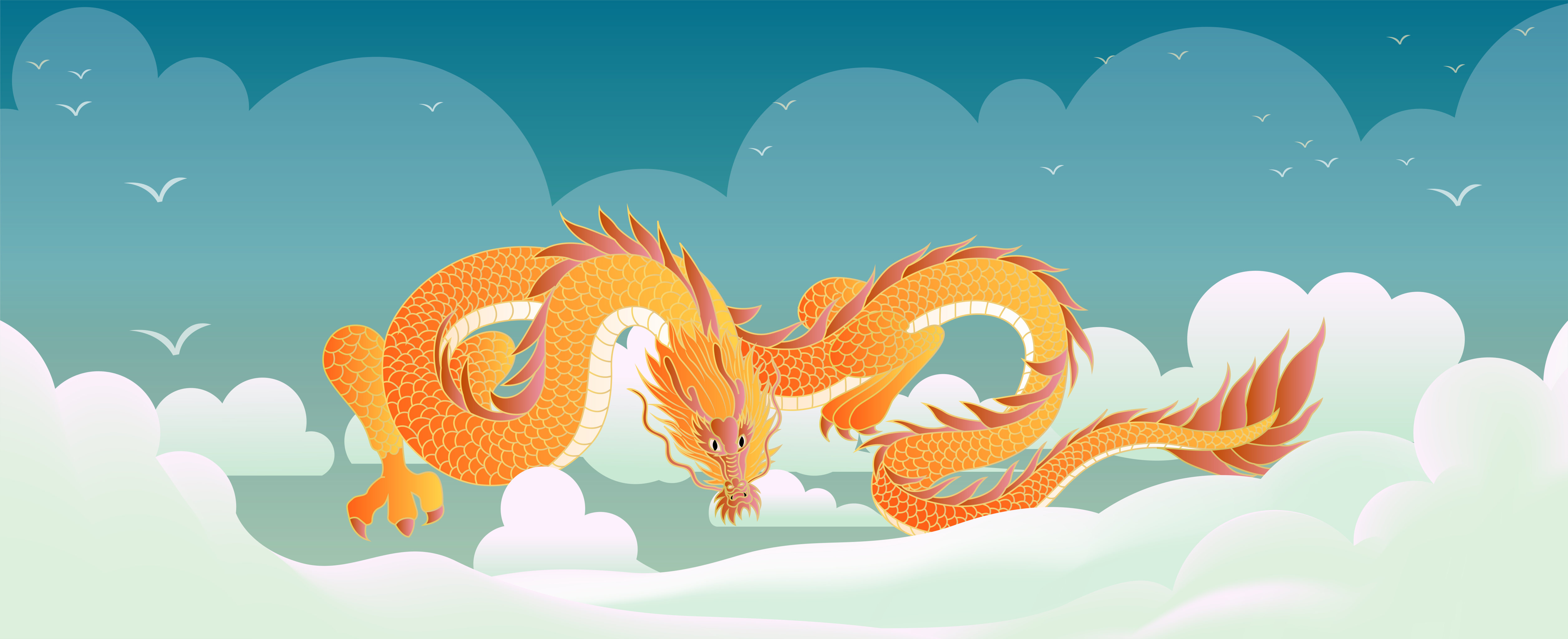 一条金色的龙匍匐在地平线上矢量插画